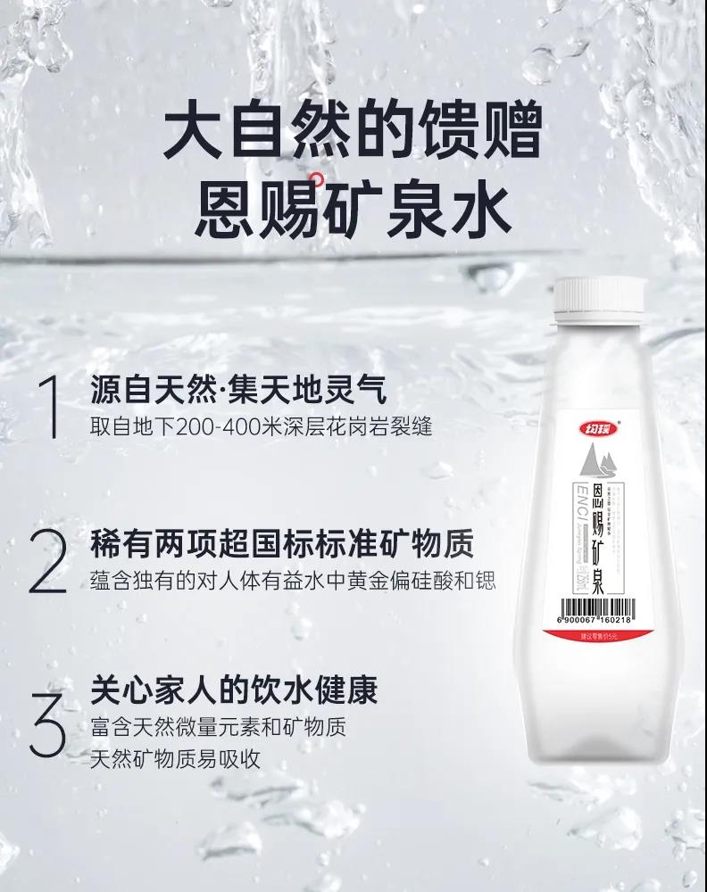 2021年4月,均瑶健康旗下矿泉水——恩赐天然矿泉水正式上市。该款产品定位高端,“恩赐”寓意“大自然的馈赠”。其水源地位于北纬30度大别山核心区,源水取自地下200—400米深层花岗岩裂缝,富含人体需要的偏硅酸、锶、锌、硒、钙等30余种微量元素,其偏硅酸和锶含量更是优于国标标准。258ml/瓶的包装规格更加小巧,减少浪费的可能性,同时与“爱我吧”谐音,传递出珍惜、爱护水资源的产品理念。