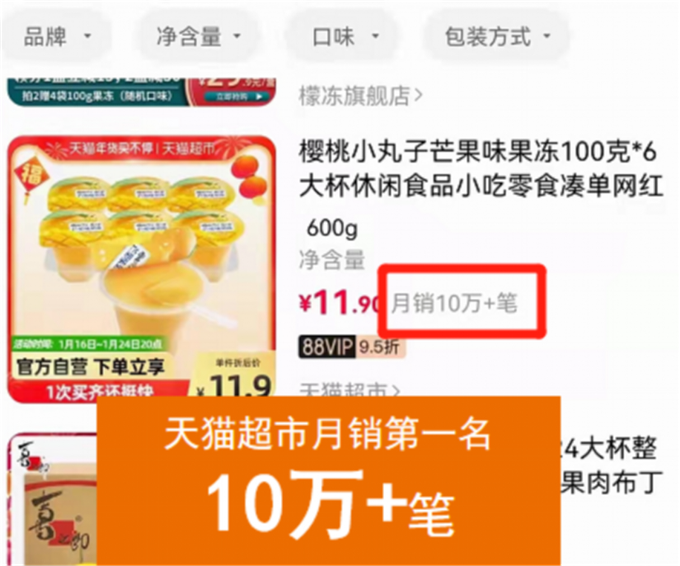 在产品软技术打磨方面,仙之宝同样下足功夫。一方面,仙之宝积极践行“质量即生命,产品即人品”理念,并通过ISO9001、ISO22000及HACCP等国际管理体系权威认证,打造果冻行业生产标杆。另一方面,仙之宝把控当代消费者对于果冻的痛点,宣导“源自海洋麒麟菜”这一更加自然的利益诉求,扫除消费者对果冻食用安全的疑虑,为自己的产品注入独特的“讨喜”基因。此次入围猫超高端零食的“清养国风果冻”和“嗦嗦乐蒟蒻果冻”就是仙之宝硬核产品力的体现,包括正在上市筹备阶段的NFC果冻也同样具备爆品基因。