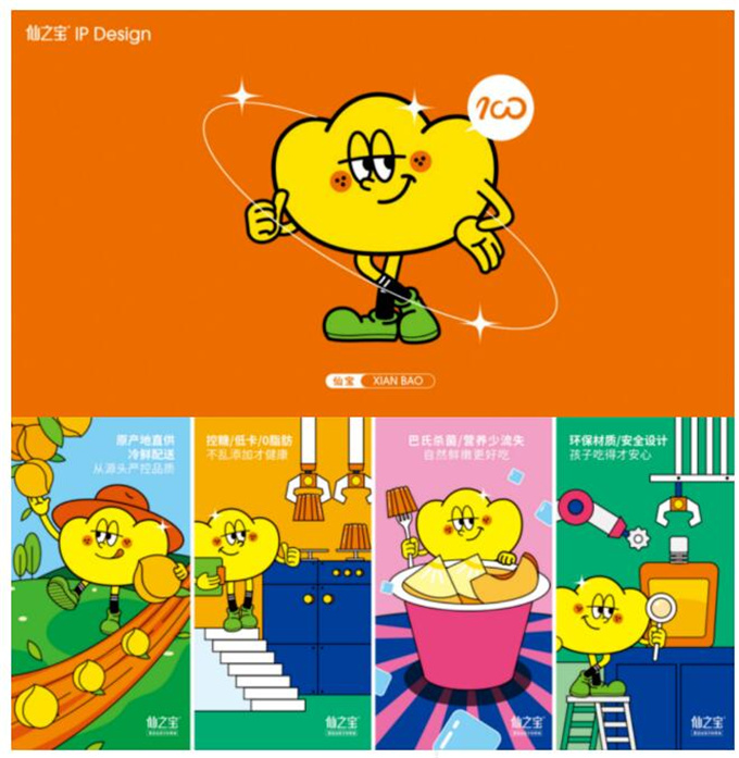 仙之宝深知单纯依靠产品在渠道终端动销,无法对品牌形成可持续的有效沉淀,与消费着建立有效沟通同样十分重要。为了进一步增强消费者互动粘性,仙之宝塑造了全新IP形象——仙宝。IP创作灵感源于中国传统文化中的超级符号——元宝,很大程度上唤醒了广大消费者对宝藏文化的熟悉感与亲和力。俏皮可爱的形象完美契合了“更适合孩子的零食”的定位。仙宝IP在产品包装、广宣物料乃至企业文化建设等周边开发得到广泛的运用。