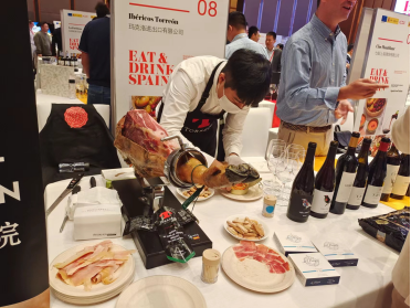 开放日当天还举办了两场大师班。第一场是FWS西班牙美食美酒葡萄酒大师班,由葡萄酒大师赵凤仪女士主讲。她带领与会者了解了西班牙葡萄酒的地理、品质和多样性,并品尝了从开放日参展商中精选的八款葡萄酒。第二场是由伊比利亚猪肉产业联合组织(ASICI)的项目主厨宣传大使举办的关于伊比利亚火腿与中餐融合的特别大师班。该课程向与会者介绍了如何将这西班牙标志性美食融入中国烹饪传统,展示了伊比利亚火腿的多样性和精致风味。