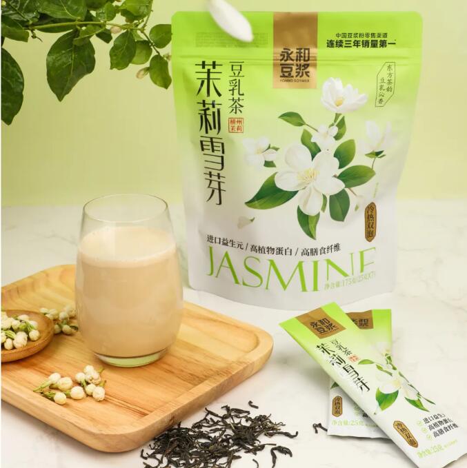 永和豆浆茉莉雪芽豆乳茶名称完整传达成分(豆乳+茉莉茶)与品牌,以“东方茶韵、豆乳沁香”为核心视觉,搭配茉莉花、茶芽等元素,传递国风雅致感,契合健康茶饮调性。单条仅101kcal(≈1个苹果),精准狙击控卡人群;雪芽绿茶27道非遗工序+广西横州茉莉花产地,强化品质稀缺性。产品适配高端商超、健康食品专卖店、写字楼自助货柜及线上健康平台。