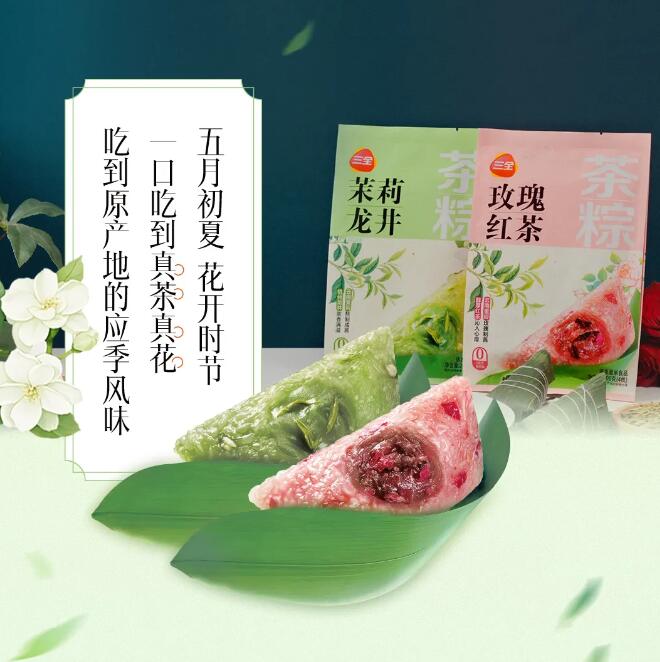 三全新中式茶粽以“真茶真花”“一口到江南”为核心卖点,搭配龙井、茉莉等元素,传递高品质与国风意境。杭州明前龙井、云南鲜采茉莉等原产地直供,强化品质背书。茶香与粽米融合,主打“糯中有香,回味悠长”的差异化口感。端午节点+“新中式”概念,适配送礼与家庭消费场景,产品可主攻高端商超、特产店、茶文化体验馆等。