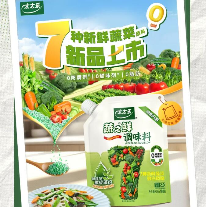 太太乐蔬之鲜调味料名称直指“蔬菜”与“鲜味”,无需教育即让消费者感知产品功能,降低认知门槛。以清新草绿色为主色调,用7种新鲜蔬菜(胡萝卜、荷兰豆、青椒等)实物图拼接成醒目的数字“7”,“特别添加螺旋藻”标识,传递健康升级信息,立式设计、加嘴密封控量功能实用性强。产品适配商超调味品专区、生鲜超市(搭配蔬菜陈列)、社区团购等。