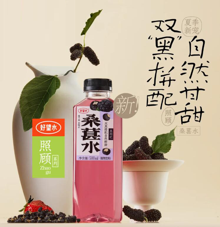 好望水“照顾系列”桑葚水以浅紫色为主色调,突出桑葚原料的天然感,瓶身桑葚、黑枸杞实拍图,搭配“双黑搭配·自然鲜甜”等标语,强化原料价值。0蔗糖、0赤藓糖醇,契合控糖与天然饮食趋势。每瓶桑葚与黑枸杞均≥150mg,强化功效可信度。经销商可主攻便利店冷柜、健康零食店、写字楼无人货柜及线上养生垂直平台,将“养生”、“控糖”、“护眼”等功能与具体消费场景深度结合。