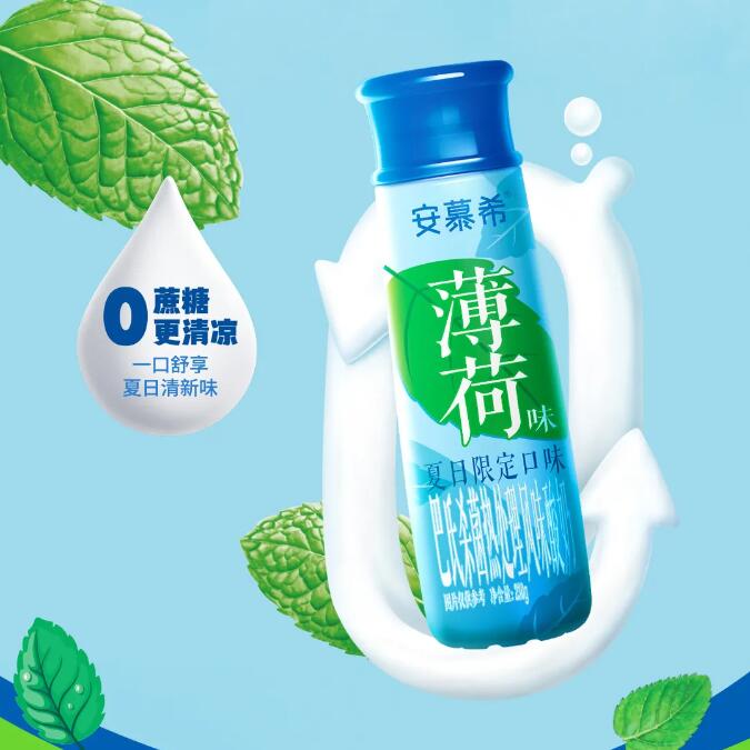 安慕希×绿箭清新薄荷味酸奶通过双品牌联名快速吸引消费者关注,以清新蓝为主色调,融合绿箭薄荷叶与安慕希酸奶杯元素,传递“清凉+浓醇”双重体验。借助绿箭“薄荷清爽”与安慕希“浓醇酸奶”的双重认知,降低市场教育成本。跨界联名突破品类边界,填补薄荷风味酸奶市场空白。经销商可主攻便利店、商超冷藏柜、校园自动贩卖机及线上即时零售平台。