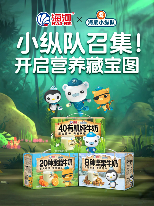 “海河×海底小纵队联名牛奶”精准绑定知名儿童IP,快速吸引家长及儿童群体;“4.0有机纯牛奶”、“20种果蔬牛奶”等命名直接点明功能(高蛋白、多营养),契合家庭健康需求。采用“海底小纵队”卡通形象(巴克队长、皮医生、呱唧),视觉冲击力强,易吸引儿童;包装突出“有机认证”、“低温研磨”、“生牛乳含量≥80%”等关键词,强化品质感。产品通过“果蔬+坚果+有机”复合营养组合,覆盖早餐、零食等多场景,差异化显著。经销商可主攻商超儿童食品专区、母婴店、幼儿园/学校周边便利店、儿童娱乐场所、社区团购等。