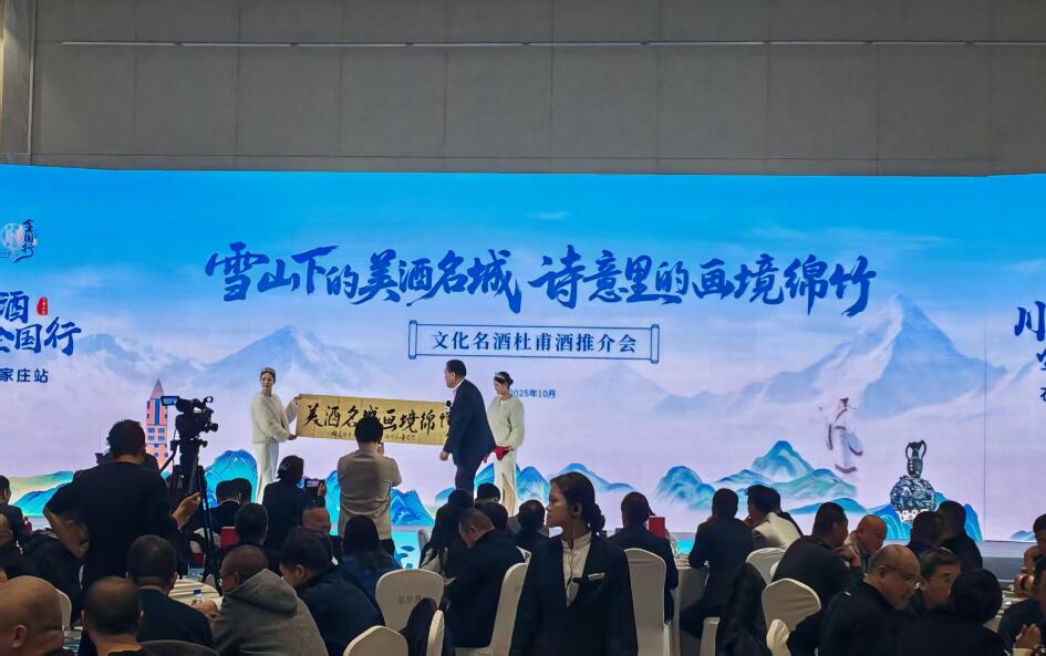 2025年10月24日晚,一场穿越千年的酒文化盛宴在石家庄塔坛贸易城众诚假日酒店盛大启幕。“文化名酒杜甫酒推介会”晚宴活动,以“雪山下的美酒名城,诗意里的画境绵竹”为主题,在诗意与酒香的交融中,为来宾们呈现了一场兼具文化深度与品牌价值的沉浸式体验。