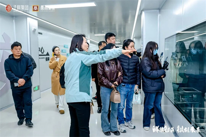 嘉宾们沿着洁净明亮的玻璃幕墙走廊参观了