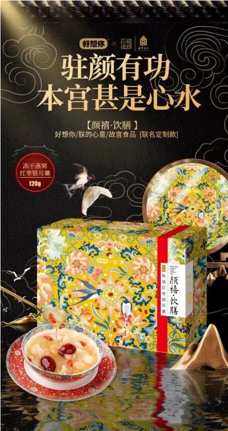 近两年,好想你推出了更多具有健康属性的高附加值的红枣衍生产品,如冻干花式燕窝、红枣湘莲银耳汤等。2018年更是联合故宫大IP,推出全新宫廷冻干燕窝银耳羹——《颜禧·饮膳》,靠高颜值与好品质,又一次引发了消费热情。
