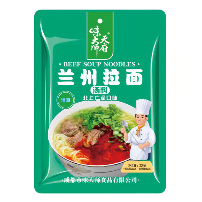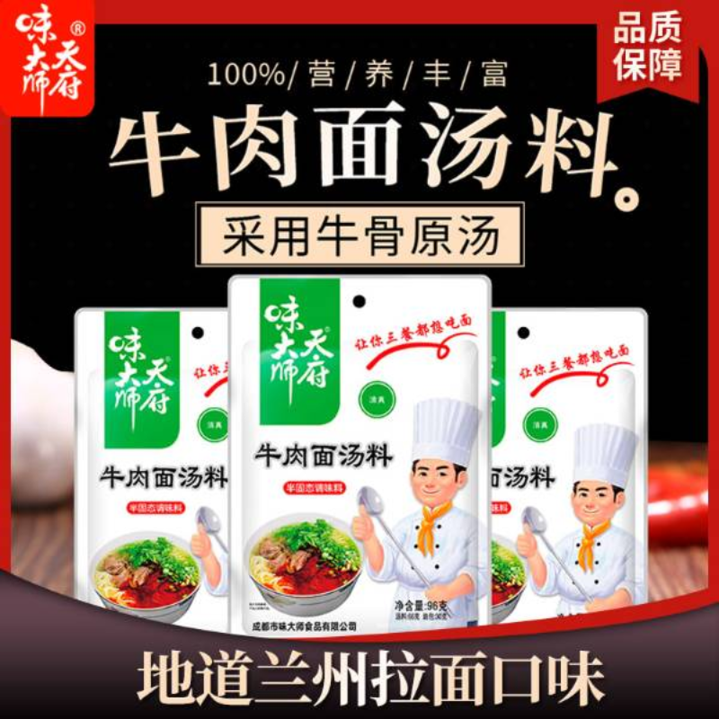 成都味大师的牛肉面汤料在先进现代生物科技(二氧化碳超临界工艺)加持下,成品汤色透亮,清澈见底,味道极其鲜美,细腻醇香。任何时候都能保证传统牛肉面汤特性:一清(汤清)、二白(萝卜白)、三红(辣椒油红)、四绿(香菜、蒜苗绿)、五黄(面条黄亮)。