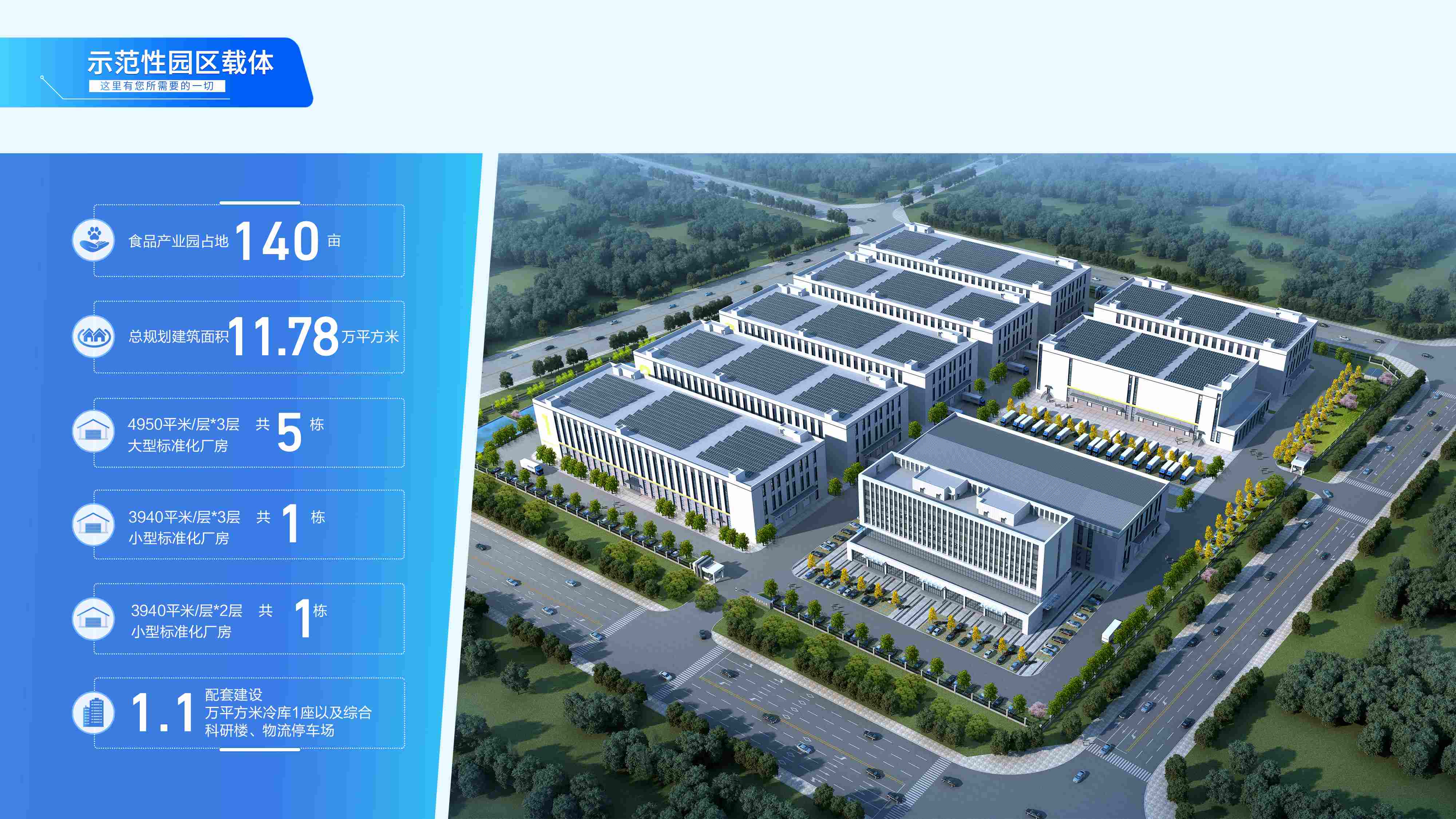 综合科研楼可满足办公、会务、电商、住宿等需求。标准化厂房各楼层货运电梯、电力配备等均按照满足独立生产设计,同时每一楼层均可分割独立使用。标准化厂房及冷库屋面已规划太阳能电池板安装,后期可有效降低入园项目用电成本。冷库目前-18℃设计,划分为6个独立区域。