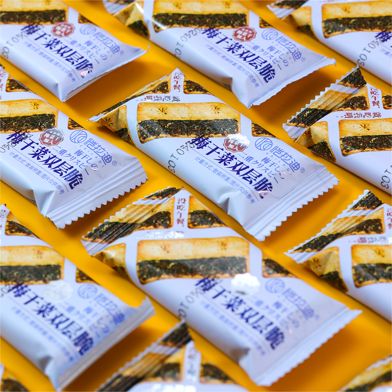 2. 双层设计:创新采用双层饼干结构,上下两层均采用烘焙工艺,每片饼干都有着薄脆的口感 ,轻轻一咬“咔嚓”作响。中间夹着梅干菜,酥脆与绵软的口感形成强烈反差 ,一口咬下,层次感拉满。