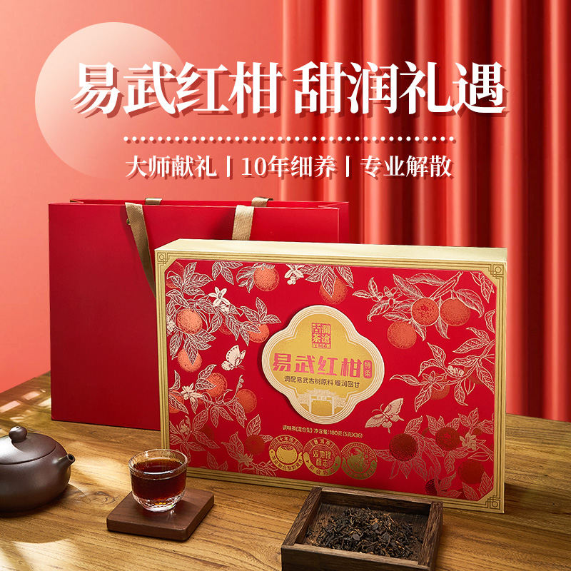 精选澜沧江流域多个古茶山宫廷级熟茶原料,经5年原产地优质藏养,再调入熟普,芽毫含量和原料精细度,多次调试成为茶底原料,与新会核心产区优选柑果,历经 56 道工序精制而成。成品圆润小巧,柑皮墨绿油润,油室眼密集、大而凹入、分布均匀;熟茶陈甜香与柑皮清新果香自然融合,香气浓郁,清新怡人,汤香饱满,冷香持久;汤色红浓透亮;茶汤稠滑,口感醇甜,清爽甘润,生津持久,韵味悠长;茶底红褐,肥嫩柔软。熟普与柑皮在香气口感上高度融合,独显韵味。