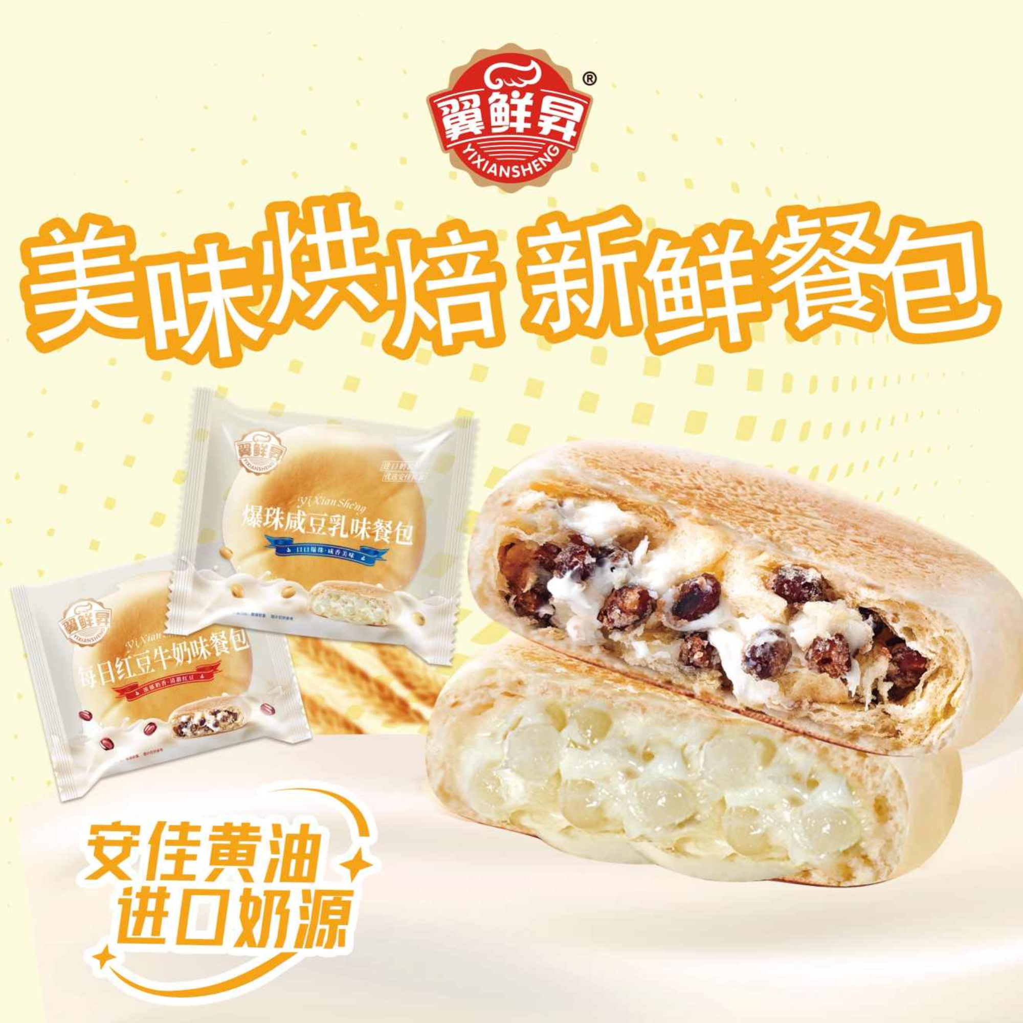 咸豆乳 + 爆珠,融合流行元素,打造差异化产品。夹心咸甜与爆珠爽脆结合,提供多重口感体验。圆形饼状造型,区别于传统餐包,货架吸引力强。独立小包装,方便早餐、茶点、零食等